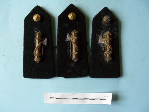 Tre controspalline con bottone ferma-passante e fregio a forma di fascio littorio, due con scure verso sinistra, una con scure verso destra. I bottoni sono decorati da un fascio littorio con scure verso destra. Una coppia di controspalline è trattenuta insieme da un filo nero.