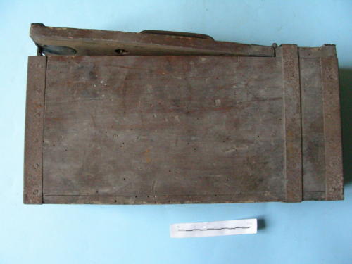 A parallelepipedo, con apertura basculante superiore con meccanismo a pulsante posto su un lato del coperchio; maniglia per il trasporto sul coperchio. Bande di rinforzo angolari fissate con viti e ulteriore banda lungo tutto il perimetro del contenitore vicino al cardine del coperchio.