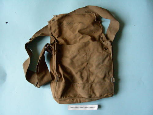 Contenitore a tasca con chiusura a bottoni a pressione e tracolla cucita su un lato e passante attraverso una maglietta sull'altro, con fermo regolabile. Due ulteriori magliette nella parte bassa anteriore. Interno diviso in due scomparti.