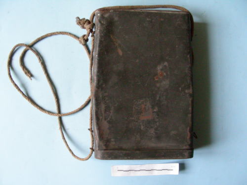 A parallelepipedo, con due magliette su un lato e tre sull'altro con tracolla a cordino in funzione anche di fermo del coperchio. Coperchio a pressione. Verniciatura di colore grigio-verde scuro.