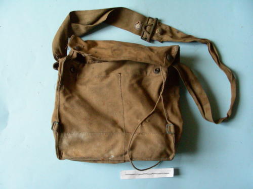 Contenitore a tasca con chiusura a bottoni a pressione e tracolla cucita su un lato e passante attraverso una maglietta sull'altro, con fermo regolabile. Due ulteriori magliette nella parte bassa anteriore. Interno diviso in due scomparti; spirale metallica cucita all'interno dello scomparto più piccolo.