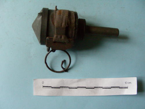 Corpo cilindrico, con coperchio conico munito di due alette di avvitamento e vite in posizione inferiore con tubo sporgente. Coppiglia della sicura con fettuccia avvolta attorno al corpo principale e terminante con gancio. Interno con semisfera sulla sommità del cilindretto fissato dall'astina della sicura.
