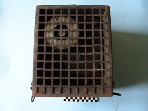 A forma di parallelepipedo, apribile, con chiusura a gancio e manico di trasporto sulla faccia superiore. Grata metallica sulla faccia posteriore; due magliette per ogni faccia laterale. All'interno, alloggiamento e manovella d'azionamento. Leva girevole e tre bulloni sulla faccia interna.