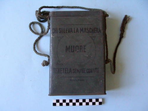 - ISCRIZIONI sul corpo principale - ----------------- CHI SI LEVA LA MASCHERA ( MUORE ) TENETELA SEMPRE CON VOI ------------------ Modello Piccolo - maiuscoli - a stampa -