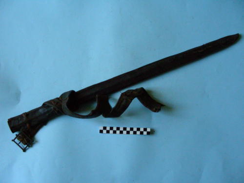 in cuoio non conciato, rivestito in pelle rossa (marocchino); decorato da motivi impressi a forma di "X" e geometrici. E' presente la cinghia di sospensione.