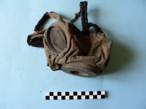 Facciale con due lenti circolari contornate da lamierina metallica, sei lacci di fissaggio alla nuca cuciti al bordo e raccordati. Alloggiamento per il filtro con foro filettato alla base.