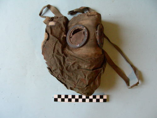 Tela rettangolare con due fori per le lenti contornati da lamierino metallico, a coprire il tampone composto di strati di garza. Lato inferiore cucito; presenti la tracolla e tre cinghie di fissaggio alla nuca, raccordate.