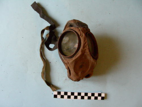 Facciale con due lenti circolari contornate da lamierina metallica ed elastici di fissaggio alla nuca. Tubo metallico di raccordo sormontato da ampia asola di lamiera, e che accoglie il tubo flessibile di collegamento con il filtro. All'interno, molla stringi-naso e boccaglio.