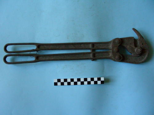 Testa a becco con lame e meccanismo di chiusura a bullone; due impugnature terminanti ad asola, incernierate rispettivamente con due ed un bullone. Vite di fissaggio posta a tre quarti delle impugnature.