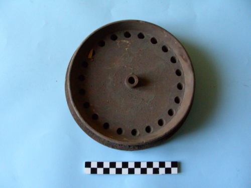 Disco di base con 22 ugelli conici inclinati sulla periferia ed uno dritto al centro, sormontato da disco filettato, di diametro leggermente inferiore, con pari numero di ugelli.