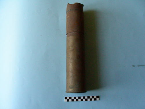 Bossolo di forma cilindrica, con fondello, su cui è stato incastrato un involucro di granata di forma cilindrica con una corona di forzamento e bordo superiore irregolare.