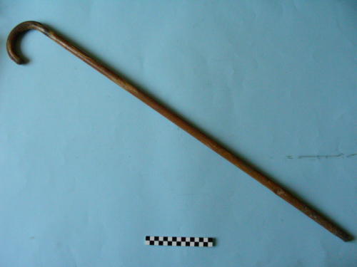 Impugnatura ricurva a manico d'ombrello; scanalatura a due terzi della lunghezza che permette di vederne l'anima in legno. Verniciato a riprodurre le nervature del legno.