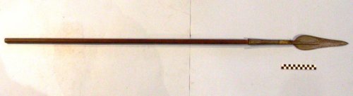 lama a foglia, punta a sezione a losanga con nervatura centrale enfatizzata da scanalatura fino a metà. Asta non originale. Filo di ottone attorcigliato attorno alla gorbia.