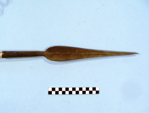 lama a foglia, punta a sezione a losanga con nervatura centrale. Asta non originale.