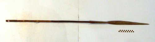 lama a forma di fuso molto allungato, punta a sezione a losanga con nervatura centrale che interessa solo la parte più larga della lama. Gorbia decorata con elementi geometrici incisi; vite di fissaggio non originale. Asta originale intagliata e dipinta con disegni geometrici verso il fondo.