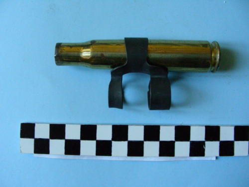 Di forma cilindrica, con fondello e restringimento all'apice. Conserva una maglietta del nastro caricatore.