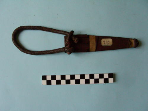 in cuoio, rivestito in pelle naturale (marocchino) rosa, decorata sulla faccia principale da incisioni a zig-zag e tre costolature in rilievo, vicino alla cappa. Puntale e fascia centrale in pelle bianca con fini striscioline in cuoio marrone. Cordella di fissaggio al braccio, in strisce di cuoio intrecciate, collegata con asola in cuoio al fodero.