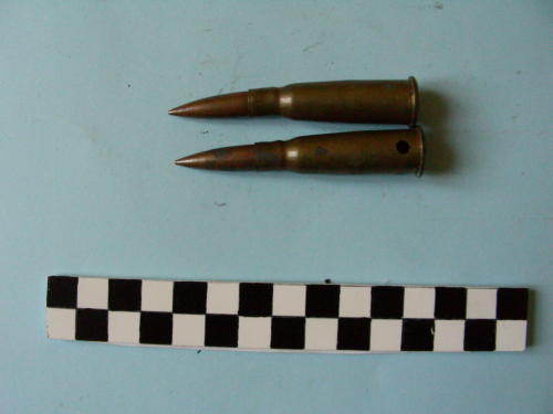 Di forma cilindrica, con fondello e restringimento all'apice del bossolo e proiettile conico.