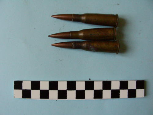Di forma cilindrica, con fondello e restringimento all'apice del bossolo e proiettile conico.