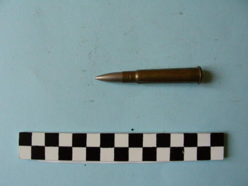 Di forma cilindrica, con fondello e restringimento all'apice del bossolo e proiettile conico.