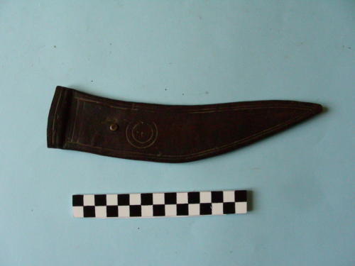 in cuoio, rivestito in pelle naturale (marocchino) scura. Sobria decorazione geometrica al centro e sui bordi. Cucitura sul retro. Presenza di una borchia nella parte superiore della faccia principale.