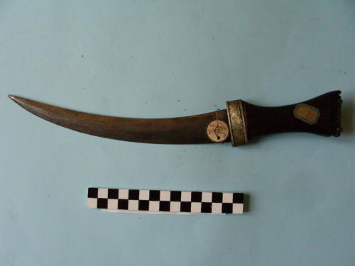 lama fucinata curva, a doppio filo, piuttosto spessa e robusta; impugnatura con inserto lavorato alla coccia. La guardia è un'ingrossamento dellimpugnatura ed è decorata con una fascia incisa a volute.