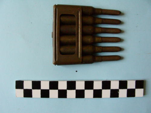 Di forma cilindrica, con fondello e restringimento all'apice del bossolo e proiettile conico. Le sei cartucce conservano una piastrina con bande laterali.