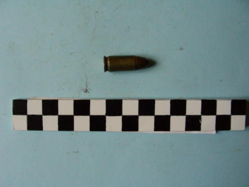 Bossolo di forma cilindrica con fondello; proiettile di forma conica con punta arrotondata.