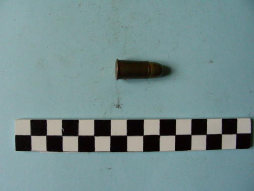 Bossolo di forma cilindrica con fondello; proiettile di forma conica con punta arrotondata.