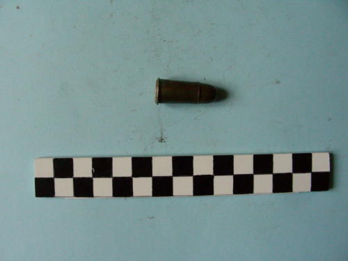 Bossolo di forma cilindrica con fondello; proiettile di forma conica con punta arrotondata.