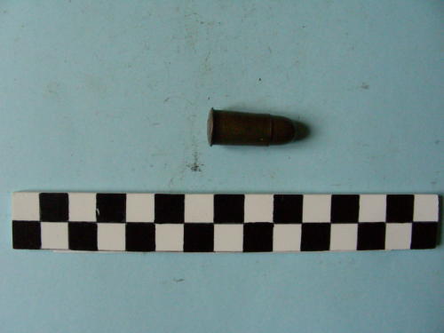 Bossolo di forma cilindrica con fondello; proiettile di forma conica con punta arrotondata.