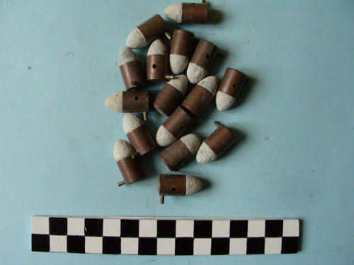 Bossolo di forma cilindrica con spillo; proiettile di forma conica con punta arrotondata.