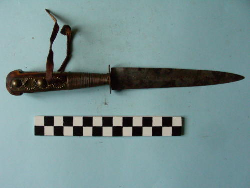 lama diritta, sottile, simmetrica, fucinata a mano, affilata ai bordi fino alla punta, molto acuminata. Il codolo è sagomato come lesterno dellimpugnatura. Puntinatura decorativa sulla lama; sulla stessa sono presenti tre bolli circolari, riempiti di resina rossa. Impugnatura in materiali compositi che rivestono il codolo: due guancette in legno fatte aderire al codolo, e con lo stesso profilo; striscioline in ottone decorate con puntinature a sbalzo e filo in ottone avvolto vicino alla guardia. La guardia è un piccolo ovale in ferro. Caratteristica peculiare è un foro passante in cui si inserisce una strisciolina di cuoio con la funzione di unire larma al fodero.