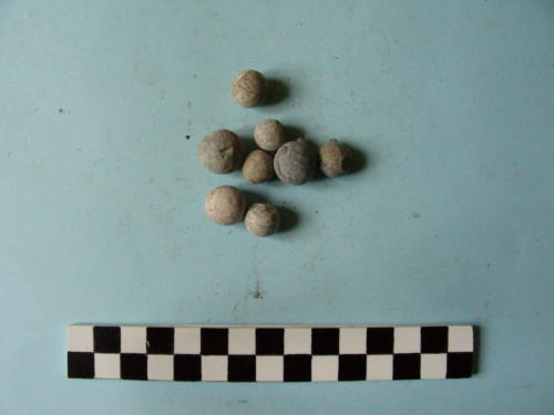 Palle da fucile sferiche di due calibri differenti: 3 maggiori e 5 più piccole.