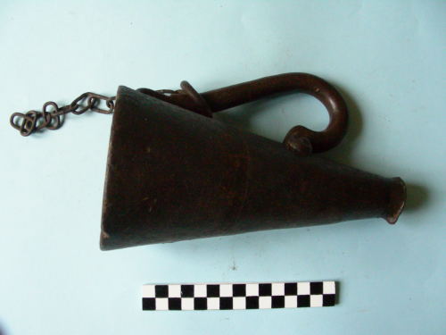 A tronco di cono, con imboccatura superiore estroflessa con beccuccio; manico laterale ad ansa, applicato al recipiente con chiodatura a ribattino; catena di fissaggio inserita al manico.