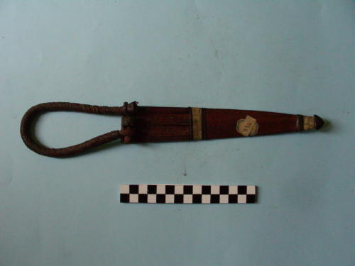 tipico di queste armi; la parte interna è fatta con due strisce sagomate di cuoio rigido, non conciato. Il rivestimento è in pelle tinta di rosso (marocchino) decorata a costole in rilievo, sul tratto alla cappa del lato esposto. E decorato con tre strisce di pelle chiara, di rettile, una alla cappa, una al centro, la terza al puntale. Questo è formato da un piccolo bottone di strisce di cuoio intrecciate. Il laccio di fissaggio allavambraccio è fatto con strisce di cuoio ritorto ed è fermato al fodero da una spina in cuoio rigido passante in un'asola fatta da strisce di pelle intrecciate.