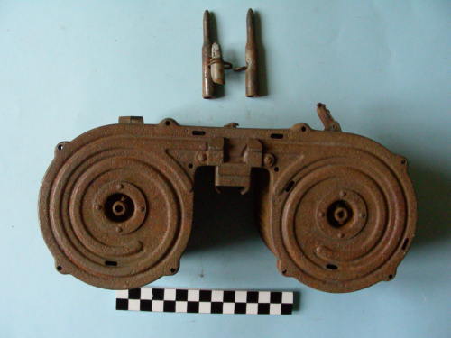 A doppio serbatoio di forma circolare, con ponte al centro per l'alimentazione dell'arma e binario di incastro. Coperchio con scanaltura a spirale, fissabile tramite dieci viti; interno con due sistemi di caricamento a molla con due bracci convergenti al centro teminanti con due finte cartucce e magliette per l'aggancio del nastro. Corpo scanalato; presenti due ulteriori finte cartucce con magliette, removibili. Due magliette in posizione superiore, per il trasporto.