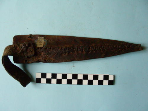 in cuoio grezzo, non conciato. La cucitura è eseguita con strisciolina di pelle. Lasola di fissaggio alla cintura è di pelle conciata, cucita al fodero con strisciolina dello stesso materiale.