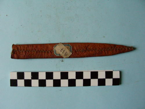 in pelle morbida, probabilmente di gazzella, cucita al centro di una delle facce in modo da calzare perfettamente sulla lama. Inserite due strisce di cuoio non conciato per irrigidire il tutto.