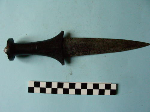 lama fucinata a mano, a forma triangolare, diritta, simmetrica, a doppio filo fino alla punta, molto acuminata. Impugnatura in un unico pezzo. La forma è quella tipica delle regioni centro-settentrionali dellEritrea. La guardia è un allargamento dellimpugnatura, mentre alla coccia è presente il tipico disco, ottenuto al tornio. Un semplice cerchio inciso decora la parte centrale dellimpugnatura. Il codolo è ribattuto su una piccola semisfera di ferro, non incisa.