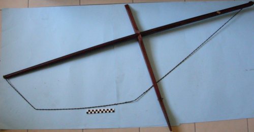 arco in legno duro a sezione ovale; tenone in legno duro a sezione rettangolare. Presenta un incavo superiore su cui adagiare il verrettone. Corda fatta con crini di animale, legati tra loro con piccoli nodi, evidenti lungo tutta la corda. E costituita da due corde ritorte, ciascuna formata da cinque cordicelle di due fili ciascuna.