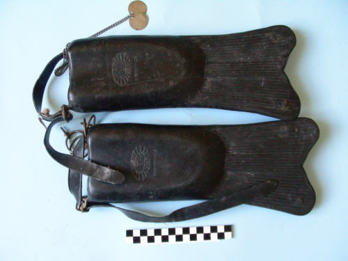 Due pinne con estremità a coda di pesce, scanalata; chiusura a cinghia con passante.
