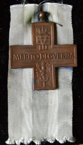 decorazione costituita da una croce greca riportante al diritto, sulle due braccia orizzontali, la scritta "MERITO DI GVERRA". Sulle braccia verticali si trova, in alto il monogramma coronato di Vittorio Emanuele III che istituì la decorazione. In basso si trova invece un gladio romano invaso di foglie d'alloro. Il retro raffigura in centro una stella a cinque punte raggiante sulle braccia della croce. Il nastro è azzurro con due strisce bianche centrali separate.