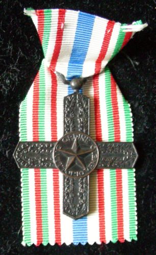 onorificenza costituita da una croce aguzza, incisa, caricata sul dritto al centro di uno scudetto a forma di stella a cinque punte; le braccia sono decorate da foglie di quercia. Al rovescio, al centro, immagine di un elmetto; sulle quattro braccia foglie di alloro. La croce è sorretta da nastro con i colori della bandiera italiana e una riga azzurra al centro.