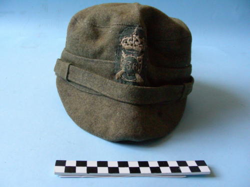 Berretto floscio, a bustina, a cilindro, con visiera e sottogola a fettuccia, posizionato sopra la visiera, cucito ai lati. Colore girgio-verde militare.