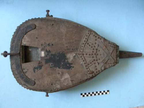 A forma di goccia, con imboccatura a tronco di cono; struttura rinforzata mediante numerose borchie con decorazioni geometriche ai due vertici. Due viti laterali per l'attacco e impugnatura a due anse e fissaggio centrale sul rinforzo posteriore per la manovra. Ulteriore rinforzo anteriore sotto la presa d'aria con gancio snodato.