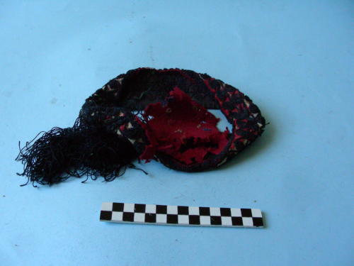Calotta di forma circolare di colore rosso; frangia di colore nero, cucita sulla parte posteriore. Bordo decorato a motivi geometrici neri su fondo rosso.