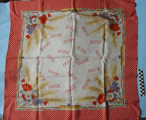 fazzoletto in tela di cotone, stampato in vari colori. Decorato tutto intorno con reticolo a losanghe dai bordi rossi. Agli angoli, mazzi di fiori e spighe. Al centro dei lati, su cornicetta formata dal tricolore italiano, quattro fasci littori di secondo tipo con scure laterale.