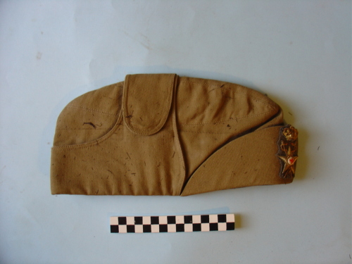 Floscia, con visiera ripiegata sulla fronte e paraorecchi fissati con bottoni automatici sulla sommità. Colore kaki militare. Fregio rettangolare con due stellette a cinque punte indicanti il grado, sul lato sinistro; fregio frontale.