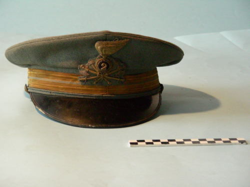 Di forma circolare di panno grigio-verde con visiera prominente e soggolo fissato alle tempie con 2 bottoni e posizionato sopra la visiera; doppia fascia di seta dorata intervallata da fascia di colore grigio-verde, fregio in posizione frontale. Interno foderato di colore verde.